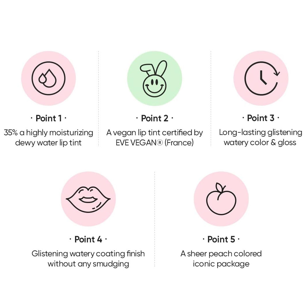 • 35% water-infused lip tint Fresh and light dewy texture adheres to your lips, with the triple structure of water-oil-water.