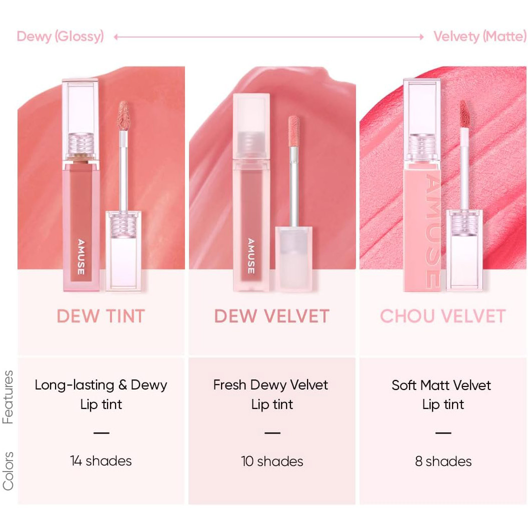 • Clear dewy colors Clear dewy colors of Amuse color vibes let lips’ natural color shine through.