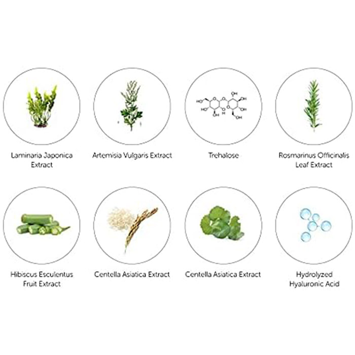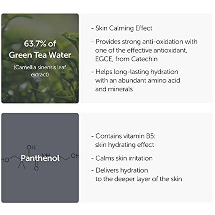 Main Ingredients: Jeju Green Tea Water 637% Panthenol Hydrolyzed Hyaluronic Acid Sub Ingredients: Hydrolyzed Jojoba ester Hydrogenated Lecithin Phytosphingosine Caproyl Sphingosine Natural Extracts Kelp Artemisia Vulgaris Trehalose Rosemary Leaf Okra Rice Centella Asiatica