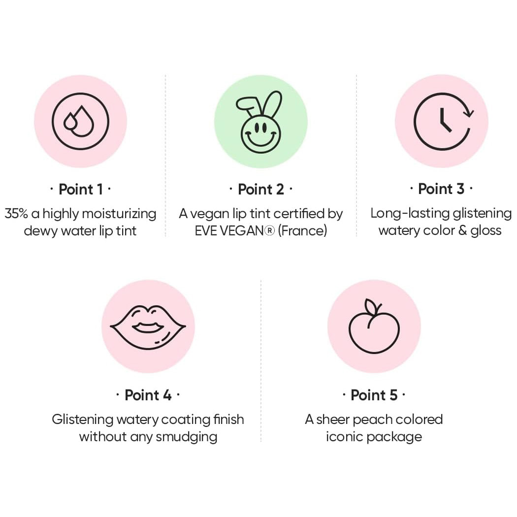 Dewy and long-lasting 35% water-infused vegan lip tint, in a light and fresh watery texture. Color pigment adheres to lips perfectly, and dewy glow rises up, leaving a water-coating finish on your lips.