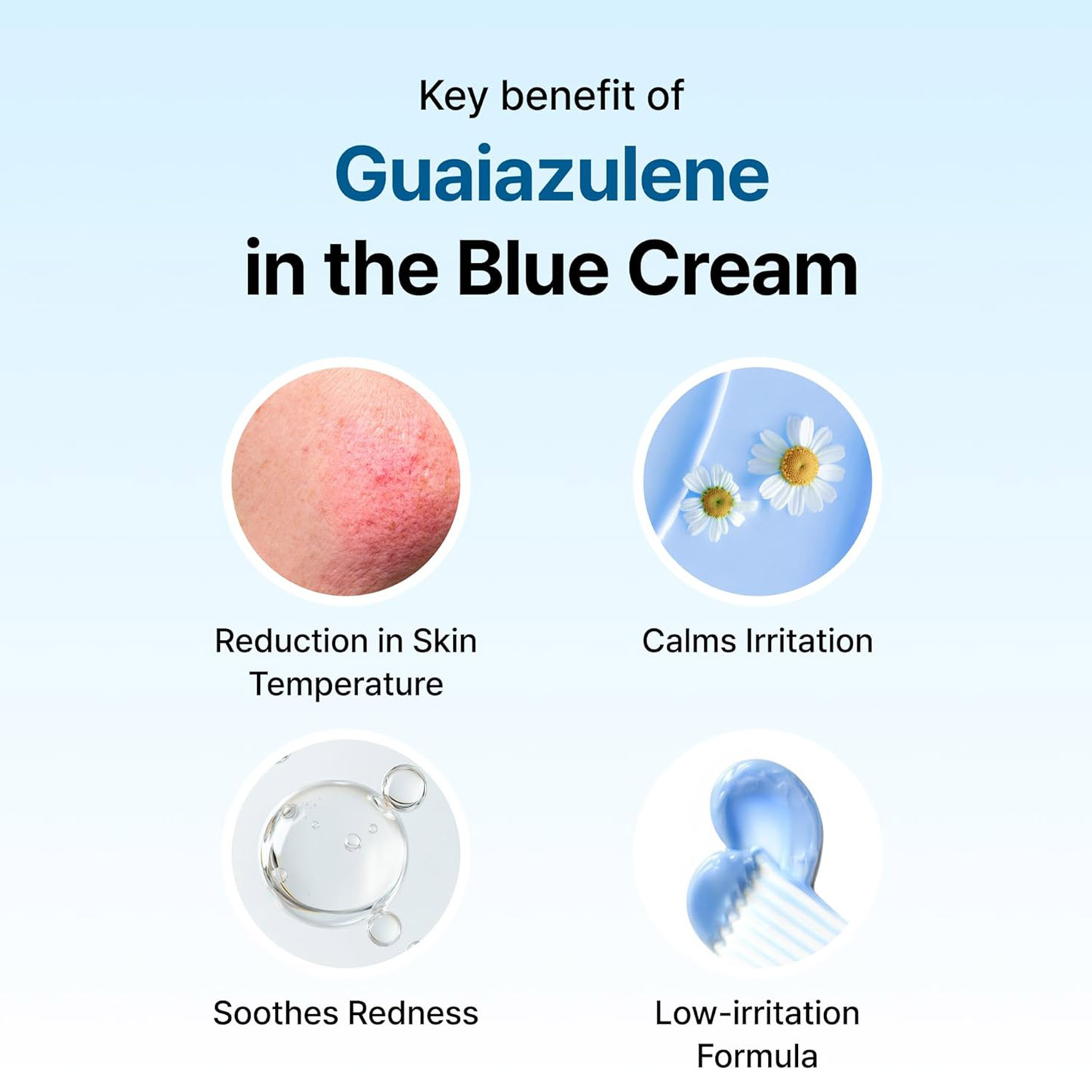 1. At the last step of your skin care routine, apply a small amount to areas of sensitivity or irritation. 2. Gently tap in to allow full absorption. Note: Use makeup only after the cream is fully absorbed into the skin. In case of spot application, apply a small, adequate amount to target areas (redness, irritated, swollen, sun burnt areas) Note: The blue coloration is due to the presence of Guaiazulene.