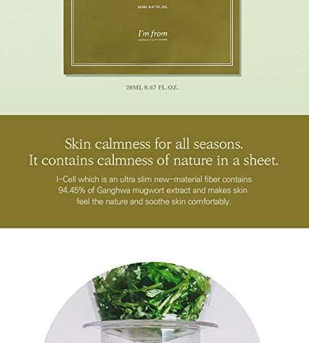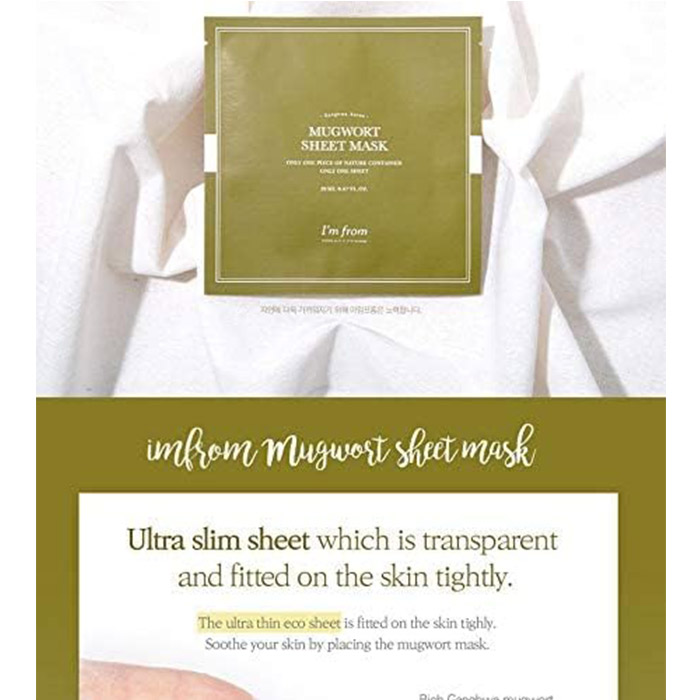 Description Only One Piece of Nature Contained Nature As It Is, It’s I’m From 91.45% Mugwort Extract I’m From Ganghwam, Korea Open Composition Honest Farm Min. Worked Material I’m From MUGWORT Sheet Mask Contains every moment of nature. It delivers effective ingredients to skin with the I-Cell sheet for sensitive skin filled in its own unique calming ingredients and purifying effects. This is real essence sheet mask filled with Mugwort essence extracted by slow release extraction method for 24 hours. Let your skin breath free with 91.45% Gangwha mugwort in the cell sheet. Experience nature as it is.