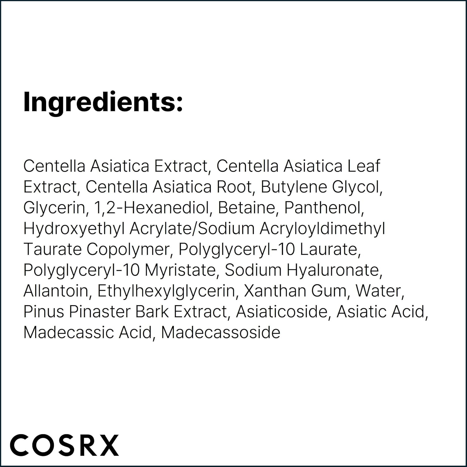 Centella AsiaticaExtract, Centella Asiatica Leaf Extract, Centella AsiaticaRoot Extract, Butylene Glycol, Glycerin, 1,2-Hexanediol, Betaine, Panthenol, Hydroxyethyl Acrylate/Sodium Acryloyldimethyl TaurateCopolymer, Polyglyceryl10 Laurate, Polyglyceryl-10 Myristate, Sodium Hyaluronate, Allantoin, Ethylhexylglycerin, Xanthan Gum, Water, Pinus Pinaster Bark Extract, Asiaticoside, Asiatic Acid, MadecassicAcid, Madecassoside