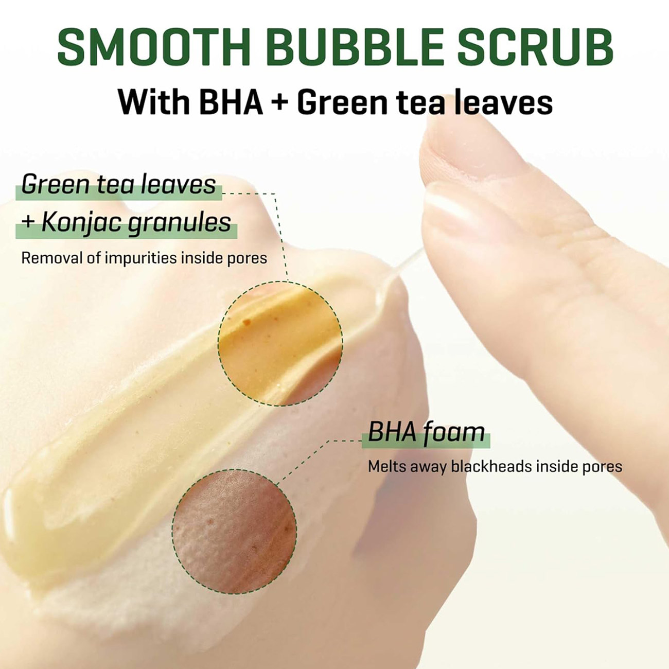 • KEY INGREDIENTS : Green tea water can provide anti-aging benefits and soothe the skin. Additionally, centella, bamboo tea, pine needles, raw green tea leaf, and konjac grains can reduce skin irritations and troubles, exfoliate gently, and provide additional benefits to leave the skin feeling refreshed and rejuvenated